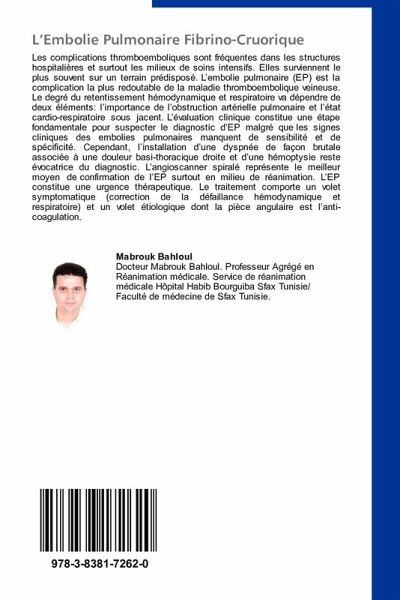 Les complications thromboemboliques sont fréquentes dans les structures hospitalières et surtout les milieux de soins intensifs. Elles surviennent le plus souvent sur un terrain prédisposé. L embolie pulmonaire (EP) est la complication la plus redoutable de la maladie thromboembolique veineuse. Le degré du retentissement hémodynamique et respiratoire va dépendre de deux éléments: l importance de l obstruction artérielle pulmonaire et l état cardio-respiratoire sous jacent. L évaluation clinique constitue une étape fondamentale pour suspecter le diagnostic d EP malgré que les signes cliniques des embolies pulmonaires manquent de sensibilité et de spécificité. Cependant, l installation d une dyspnée de façon brutale associée à une douleur basi-thoracique droite et d une hémoptysie reste évocatrice du diagnostic. L angioscanner spiralé représente le meilleur moyen de confirmation de l EP surtout en milieu de réanimation. L EP constitue une urgence thérapeutique. Le traitement comporte un volet symptomatique (correction de la défaillance hémodynamique et respiratoire) et un volet étiologique dont la pièce angulaire est l anti-coagulation.