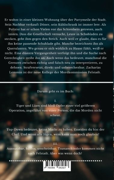 Er wohnt in einer kleinen Wohnung über der Partymeile der Stadt. Sein Nachbar verkauft Döner, sein Kühlschrank ist immer leer. Als Polizist hat er schon Vielen vor das Schienbein getreten, auch intern. Dass die Gesellschaft versucht, Leute in Schubladen zu stecken geht ihm gegen den Strich. Auch weil er glaubt, dass es für ihn keine passende Schublade gibt. Manche bezeichnen ihn als Querulanten. Wo genau er sich wirklich zu Hause fühlt weiß er nicht. Eine düstere Vergangenheit verfolgt ihn und die Suche nach Gerechtigkeit treibt ihn an. Auch wenn das bedeutet, manchmal due Grenzen weischen richtig und falsch neu zu interpretieren, zu dehnen. Strafversetzt, direkt und unberechenbar. Zacharias Lemmin ist der neue Kollege der Mordkommission Felstadt.Darum geht es im Buch:I. Tiger und Liam sind bloß Opfer einer viel größeren Operation, angeführt von einer Person, die das Morden nicht scheut.II. Top-Down bedeutet, keine Macht zu haben. Esseiden du bist der Chef. Und wenn alle lügen, wem kann man noch glauben?III. Ausnutzbar, hilflos, unscheinbar. Tsunamikinder kommen nicht nach Felstadt. Aber was wenn doch?