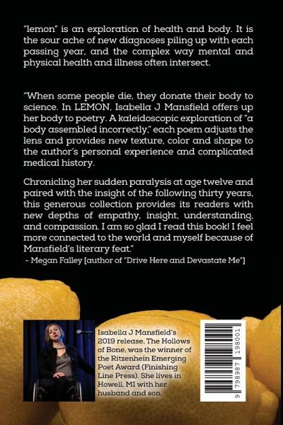 lemon is an exploration of body and health. The poems in this chapbook come from learning to navigate life with a disability, anxiety and depression, bodily changes, illness and associated medical trauma, and the intersection of physical and mental health.