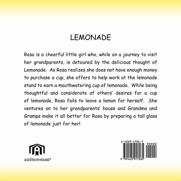 Rosa is a cheerful little girl who, while on a journey to visit her grandparents, is detoured by the delicious thought of Lemonade. As Rosa realizes she does not have enough money to purchase a cup, she offers to help work at the lemonade stand to earn a mouthwatering cup of lemonade. While being thoughtful and considerate of others' desires for a cup of lemonade, Rosa fails to leave a lemon for herself. She ventures on to her grandparents' house and Grandma and Gramps make it all better for Rosa by preparing a tall glass of lemonade just for her!