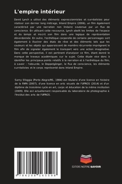 David Lynch a utilisé des éléments expressionnistes et surréalistes pour réaliser son dernier long métrage, Inland Empire (2006), un film également caractérisé par une narration non linéaire soutenue par un flux de conscience. En utilisant cette ressource, Lynch abolit les limites de l'espace et du temps et inscrit son film dans une logique de représentation désordonnée. En outre, l'esthétique corporelle de certains personnages sert également à illustrer des états de rêve et des éléments tels que les couleurs et les objets qui apparaissent de manière récurrente imprègnent le film afin de signaler également le transport vers une action imaginative. Dans cette perspective, il est pertinent d'analyser ce film, étant donné le manque de travaux académiques sur le sujet. Cette étude vise donc à identifier les principaux points relatifs à la narration et à l'esthétique du film, à savoir : l'absurde, le Doppelgänger, le flux de conscience, les éléments surréalistes et le corps représenté dans Inland Empire.