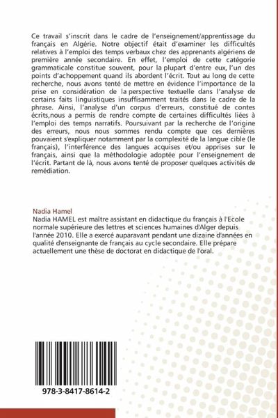 Ce travail s'inscrit dans le cadre de l'enseignement/apprentissage du français en Algérie. Notre objectif était d'examiner les difficultés relatives à l'emploi des temps verbaux chez des apprenants algériens de première année secondaire. En effet, l'emploi de cette catégorie grammaticale constitue souvent, pour la plupart d'entre eux, l'un des points d'achoppement quand ils abordent l'écrit. Tout au long de cette recherche, nous avons tenté de mettre en évidence l'importance de la prise en considération de la perspective textuelle dans l'analyse de certains faits linguistiques insuffisamment traités dans le cadre de la phrase. Ainsi, l'analyse d'un corpus d'erreurs, constitué de contes écrits,nous a permis de rendre compte de certaines difficultés liées à l'emploi des temps narratifs. Poursuivant par la recherche de l'origine des erreurs, nous nous sommes rendu compte que ces dernières pouvaient s'expliquer notamment par la complexité de la langue cible (le français), l'interférence des langues acquises et/ou apprises sur le français, ainsi que la méthodologie adoptée pour l'enseignement de l'écrit. Partant de là, nous avons tenté de proposer quelques activités de remédiation.