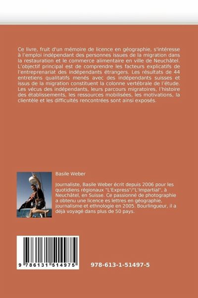 Ce livre, fruit d''un mémoire de licence en géographie, s''intéresse à l''emploi indépendant des personnes issues de la migration dans la restauration et le commerce alimentaire en ville de Neuchâtel. L''objectif principal est de comprendre les facteurs explicatifs de l''entreprenariat des indépendants étrangers. Les résultats de 44 entretiens qualitatifs menés avec des indépendants suisses et issus de la migration constituent la colonne vertébrale de l''étude. Les vécus des indépendants, leurs parcours migratoires, l''histoire des établissements, les ressources mobilisées, les motivations, la clientèle et les difficultés rencontrées sont ainsi exposés.