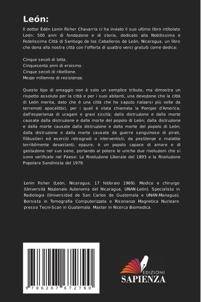 Il dottor Edén Lenin Fisher Chavarría ci ha inviato il suo ultimo libro intitolato León: 500 anni di fondazione e di storia, dedicato alla Nobilissima e Fedelissima Città di Santiago de los Caballeros de León, Nicaragua, un libro che dona alla nostra città con l'offerta di quattro versi gratuiti come dedica:Cinque secoli di lotta.Cinquecento anni di eroismo.Cinque secoli di ribellione.Mezzo millennio di resistenza.Questo tipo di omaggio non è solo un semplice tributo, ma dimostra un rispetto assoluto per la città e per i suoi abitanti, una devozione che la città di León merita, dato che è una città che ha saputo rialzarsi più volte da terremoti apocalittici, per i quali è stata chiamata la Pompei d'America; dall'esperienza di uragani e gravi siccità; dalla distruzione e dalla morte causate dalla distruzione e dalla morte del popolo di León; dalla distruzione e dalla morte causate dalla distruzione e dalla morte del popolo di León; dalla distruzione e dalla morte causate da guerre sanguinose di pirati, filibustieri ed eserciti retrogradi o interventisti; da pestilenze e malattie terribilmente devastanti; eppure, è un popolo capace di amare e di gestazione nel suo seno, portando al potere le uniche due rivoluzioni che si sono verificate nel Paese: La Rivoluzione Liberale del 1893 e la Rivoluzione Popolare Sandinista del 1979.
