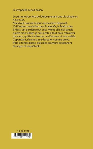 Je m'appelle Léna Faosen.Je suis une Sorcière de l'Aube menant une vie simple et heureuse.Mais tout bascule le jour où ma mère disparaît. J'ai l'intime conviction que Zrygolafk, le Maître des Enfers, est derrière tout cela. Même si je n'ai jamais quitté mon village, je suis prête à tout pour retrouver ma mère, quitte à affronter les Démons et leurs alliés.Cependant, rien ne va se dérouler comme prévu.Plus le temps passe, plus mes pouvoirs deviennent étranges et inquiétants.