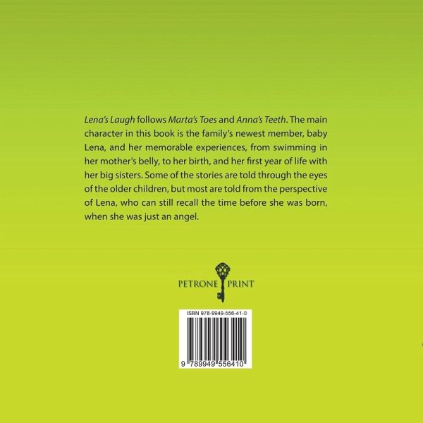 Lena's Laugh follows Epp Petrone's beloved children's books Marta's Toes and Anna's Teeth. The main character in this book is the family's newest member, baby Lena, and her memorable experiences, from swimming in her mother's belly, to her birth, and her first year of life with her big sisters. Some of the stories are told through the eyes of the older children, but most are told from the perspective of Lena, who can still recall the time before she was born, when she was just an angel.