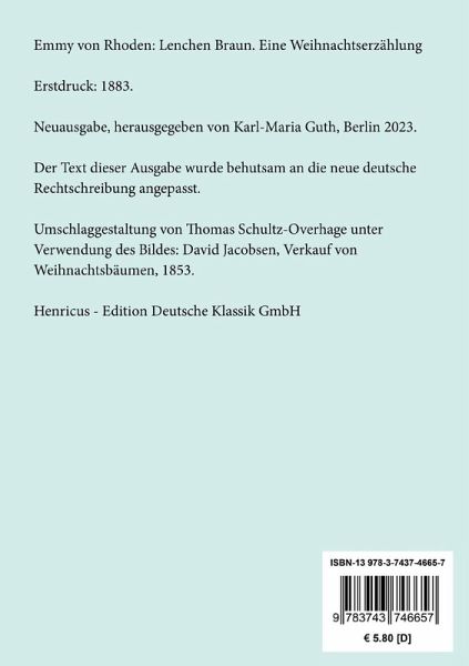 Emmy von Rhoden: Lenchen Braun. Eine WeihnachtserzählungErstdruck: 1883.Neuausgabe, herausgegeben von Karl-Maria Guth, Berlin 2023.Der Text dieser Ausgabe wurde behutsam an die neue deutsche Rechtschreibung angepasst.Umschlagabbildung: David Jacobsen, Verkauf von Weihnachtsbäumen, 1853Gesetzt aus der Minion Pro, 11 pt.Die Sammlung Hofenberg erscheint im Verlag Henricus - Edition Deutsche Klassik GmbH, Berlin
