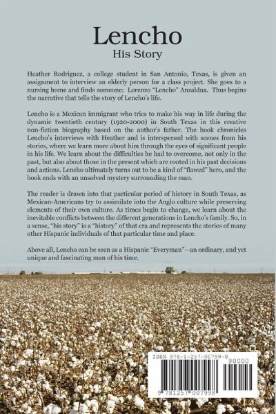 Heather Rodriguez, a college student in San Antonio, Texas, is given an assignment to interview an elderly person. Lorenzo "Lencho" Anzaldua becomes her subject. As he tells his story we become familiar with him through his narrative and also through the eyes of significant people in his life. The setting for this creative non-fiction book is South Texas during the turbulent 20th century (1920 - 2004). The story chronicles the culture clashes and generational conflicts that came along with being Hispanic during that time and in that area of the country. We learn about the difficulties Lencho had to overcome in trying to assimilate into a largly Anglo culture and raise a family during a time fraught with social changes. The book ends with an unsolved mystery surrounding the man. Based on the life of the author's father, Lencho is a Hispanic Everyman...an ordinary, and yet unique and fascinating man of his time.