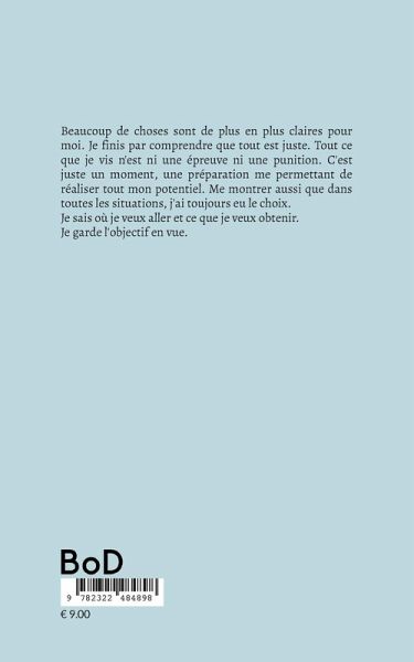 Beaucoup de choses sont de plus en plus claires pour moi. Je finis par comprendre que tout est juste. Tout ce que je vis n'est ni une épreuve ni une punition. C'est juste un moment, une préparation me permettant de réaliser tout mon potentiel. Me montrer aussi que dans toutes les situations, j'ai toujours eu le choix. Je sais où je veux aller et ce que je veux obtenir.Je garde l'objectif en vue.