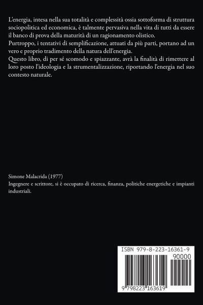L'energia, intesa nella sua totalità e complessità ossia sottoforma di struttura sociopolitica ed economica, è talmente pervasiva nella vita di tutti da essere il banco di prova della maturità di un ragionamento olistico. Purtroppo, i tentativi di semplificazione, attuati da più parti, portano ad un vero e proprio tradimento della natura dell'energia. Questo libro, di per sé scomodo e spiazzante, avrà la finalità di rimettere al loro posto l'ideologia e la strumentalizzazione, riportando l'energia nel suo contesto naturale.