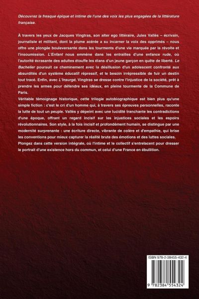 Découvrez la fresque épique et intime de l'une des voix les plus engagées de la littérature française.À travers les yeux de Jacques Vingtras, son alter ego littéraire, Jules Vallès - écrivain, journaliste et militant, dont la plume acérée a su incarner la voix des opprimés - nous offre une plongée bouleversante dans les tourments d'une vie marquée par la révolte et l'insoumission. L'Enfant nous emmène dans les entrailles d'une enfance rude, où l'autorité écrasante des adultes étouffe les élans d'un jeune garçon en quête de liberté. Le Bachelier poursuit ce cheminement avec la désillusion d'un adolescent confronté aux absurdités d'un système éducatif répressif, et le besoin irrépressible de fuir un destin tout tracé. Enfin, avec L'Insurgé, Vingtras se dresse contre l'injustice de la société, prêt à prendre les armes pour défendre ses idéaux, en pleine tourmente de la Commune de Paris.Véritable témoignage historique, cette trilogie autobiographique est bien plus qu'une simple fiction : c'est le cri d'un homme qui, à travers ses épreuves personnelles, raconte la lutte de tout un peuple. Vallès y dépeint avec une lucidité tranchante les contradictions d'une époque, offrant un regard incisif sur les injustices sociales et les espoirs révolutionnaires. Son style, à la fois incisif et profondément humain, se distingue par une modernité surprenante : une écriture directe, vibrante de colère et d'empathie, qui brise les conventions pour mieux capturer la réalité brute des émotions et des luttes sociales.Plongez dans cette version intégrale, où l'intime et le collectif s'entrelacent pour dresser le portrait d'une existence hors du commun, et celui d'une France en ébullition.