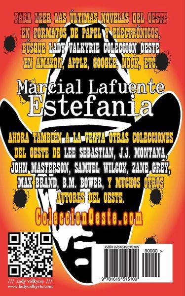 LENGUA DE SERPIENTE Marcial Lafuente Estefanía Lady Valkyrie Colección Oeste(R) >...Y en el viejo y legendario Oeste, un malhechor y forajido junto a su grupo de villanos intentarán que sus nombres y apodos no queden olvidados en la historia del salvaje oeste... En el salvaje oeste Americano, también conocido como "far west" o "wild west", los vaqueros (cowboys) y los pistoleros (gunman) se repartían las aventuras a partes iguales siendo héroes y villanos, dependiendo de la zona y de la situación en la que se encontraban. Los famosos relatos sobre el viejo o lejano oeste coincidieron con la exploración de los territorios vírgenes del "oeste" Americano. El estilo de vida que tuvieron en el viejo oeste estaba ligado a la explotación de las minas, la crianza de ganado, y el cultivo de la tierra. Las ciudades del viejo oeste eran unas cuantas casas de madera, una tienda para comprar los artículos variados, varias cantinas (saloons), la oficina con cárcel del sheriff, una pequeña escuela, y a veces un local de oración. Era una época de violencia, donde es habitual el uso del plomo y de la cuerda, para solucionar todo tipo de problemas. Y un lugar en el que la justicia del ojo por ojo era la salsa de cada día, y donde el Colt era el instrumento favorito para solucionar problemas. La Colección Oeste(R) le presenta las mejores historias del oeste en Español. Para leer las últimas novedades, visite la página internet de Amazon o nuestra página web localizada en ladyvalkyrie.com(R). También están a la venta otras colecciones del oeste en Español de los grandes autores como FRANK DUGGAN, LEE SEBASTIAN, J.J. MONTANA, SAMUEL WILCOX, ZANE GREY, B.M. BOWER, MARCIAL LAFUENTE ESTEFANÍA, MAX BRAND, CARLOS CLEVELAND, y de muchos otros más. Visítenos en ColeccionOeste.com(R) para ver todas las últimas novedades. Lady Valkyrie también dispone de un amplio catálogo de publicaciones en muchísimos géneros desde las aventuras del oeste, los clásicos, los grandes de la literatura, la novela negra, cuentos escolares, la novela gótica, libros de ayuda, libros religiosos, aprendizaje de idiomas, y muchos otros temas para todos los gustos y edades. LadyValkyrie.com(R)