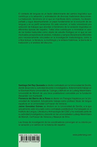 El contacto de lenguas es un factor determinante del cambio lingüístico que contribuye a la adopción y aclimatación de diversas tradiciones discursivas. La traducción, fenómeno en el que se manifiesta dicho contacto, ha desempeñado y sigue desempeñando un papel fundamental en la evolución de las lenguas y en su perfil variacional. En este volumen, el lector encontrará una selección de trabajos que abordan el fenómeno de la variación lingüística en diferentes épocas del español. Todos ellos contribuyen a reivindicar el valor de los textos traducidos como objeto de estudio filológico en el que se ven implicados perspectivas de análisis, métodos y campos disciplinares diferentes pero necesariamente vinculados en la investigación traductológica, como la crítica textual, la literatura, la morfología y la sintaxis históricas, la teoría de la traducción y el análisis del discurso.