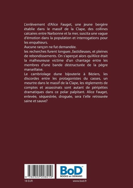 Le cambriolage dune bijouterie à Béziers, les discordes entre les protagonistes du casses, un meurtre dans le massif de la Clape, les règlements de comptes et assassinats sont autant de péripéties dramatiques dans ce polar palpitant. Alice Fauget, enlevée, séquestrée, droguée, sera t'elle retrouvée saine et sauve?