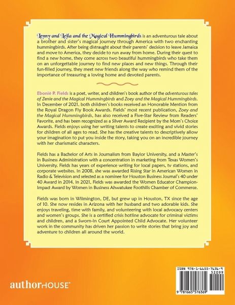 Lenny and Leila and the Magical Hummingbirds is an adventurous tale about a brother and sister's magical journey through America with two enchanting hummingbirds. After being distraught about their parents' decision to leave Jamaica and move to America, they decide to run away from home. During their quest to find a new home, they come across two beautiful hummingbirds who take them on an unforgettable journey to find new places and new things. Through their fun-filled journey, they meet new friends along the way who remind them of the importance of treasuring a loving home and devoted parents.
