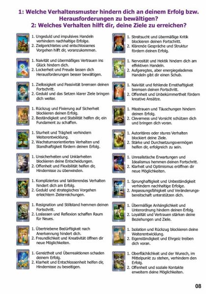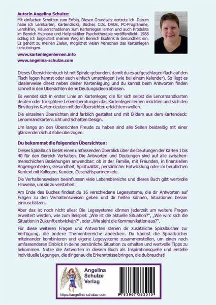 Lenormand Deutung leicht gemacht 10: Fragen, Antworten und Legesysteme zum Verhalten in allen Lebenslagen als DIN A4 Übersichten für den schnellen Deutungsblick * Buch im Farbdruck und DIN A4 Format (21 cm x 29,7 cm). * Glänzende Laminierung (Schutzschicht) auf allen Seiten. * In Spirale gebunden, damit es flach auf dem Tisch liegen bleibt. Dieses Übersichtenbuch ist mit Spirale gebunden, damit du es aufgeschlagen flach auf den Tisch legen kannst oder auch einfach umschlagen (wie bei einem Kalender). So liegt es idealerweise direkt neben deiner Kartenlegung und du kannst beim Antworten finden schnell in den Übersichten deine Deutungsideen ablesen. Es wendet sich in erster Linie an Kartenleger, die für sich selbst die Lenormandkarten deuten oder für spätere Lebensberatungen das Kartenlegen lernen möchten und sich den Einstieg ins Karten deuten mit den Übersichten erleichtern wollen. Die einzelnen Übersichten sind farblich gestaltet und mit Bildern aus dem Kartendeck: Lenormandkarten Licht und Schatten Design. Um lange an den Übersichten Freude zu haben sind alle Seiten beidseitig mit einer glänzenden Schutzfolie überzogen. Du bekommst die folgenden Übersichten: Dieses Spiralbuch bietet einen umfassenden Überblick über die Deutungen der Karten 1 bis 40 für den Bereich Verhalten. Die Antworten und Deutungen sind auf alle zwischen-menschlichen Beziehungen anwendbar: ob in der Familie, mit Freunden, in finanziellen Angelegenheiten, Gesundheit, Spiritualität, persönlicher Entwicklung oder im beruflichen Kontext mit Kollegen, Kunden, Geschäftspartnern etc. Die Verhaltensweisen beeinflussen viele Lebensbereiche und dieses Buch gibt wertvolle Hinweise, um sie zu verstehen. Am Ende des Buches findest du 16 verschiedene Legesysteme, die dir Antworten auf Fragen zu den Verhaltensweisen geben und dir helfen können, Situationen besser einzuschätzen. Aber das ist noch nicht alles: Die Legesysteme können jederzeit um weitere Fragen erweitert werden, wie zum Beispiel: "Wie ist die aktuelle Situation?", "Wie wird sich die Situation in Zukunft entwickeln?", oder "Wie sieht die Kommunikation aus?". Für diese weiteren Fragen und Antworten stehen dir zusätzliche Spiralbücher zur Verfügung, die andere Themenbereiche abdecken. Du kannst die Spiralbücher miteinander kombinieren und eigene Legesysteme zusammenstellen, um einen noch umfassenderen Einblick in deine persönliche Situation zu erhalten und wertvolle Tipps zu bekommen. Nutze die Antworten in diesem Buch als Inspirationsquelle und erstelle individuelle Legungen, die dir genau die Erkenntnisse bringen, die du brauchst!