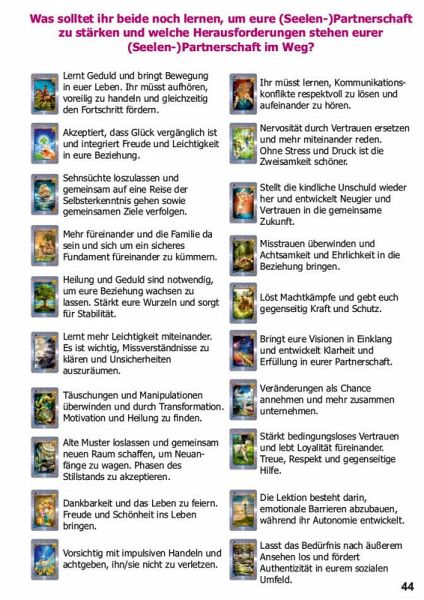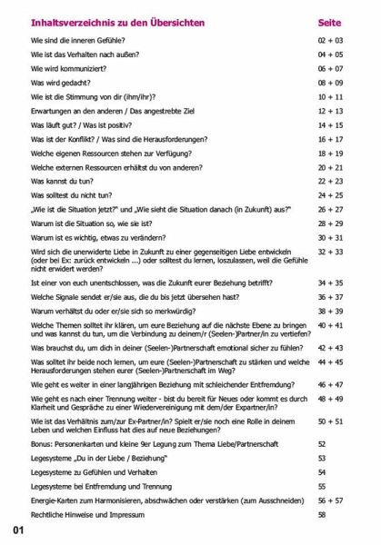 Lenormand Deutung leicht gemacht 8: Fragen, Antworten und Legesysteme zur Liebe und (Seelen-) Partnerschaft als DIN A4 Übersichten für den schnellen Deutungsblick * Buch im Farbdruck und DIN A4 Format (21 cm x 29,7 cm). * Glänzende Laminierung (Schutzschicht) auf allen Seiten. * In Spirale gebunden, damit es flach auf dem Tisch liegen bleibt. In diesem Übersichtsbuch tauchst du ein in die Welt der Liebe und (Seelen-) Partnerschaft, begleitet von präzisen Deutungen der 40 Lenormandkarten. Ob innere Befindlichkeit, äußeres Verhalten, Kommunikation oder tiefere Beziehungsthemen - Band 8 meiner Spiralbuchreihe "Lenormand Deutung leicht gemacht" gibt dir einen Überblick über alle Phasen der Liebe. Die Fragen und Antworten der Karten helfen, die Dynamik der Beziehung zu verstehen, Fragen nach Entwicklungspotenzialen zu beantworten und klärende Hinweise für die Zukunft zu finden. Von der ersten Suche nach Liebe bis zur Stabilisierung einer langjährigen Partnerschaft oder dem Verhalten nach einer Trennung. Dieses Buch gibt wertvolle Antworten auf Fragen zur Entwicklung von Partnerschaften, zum Umgang mit Herausforderungen und Konflikten und zu den Chancen für eine erfüllte Beziehung. Ganz gleich, ob es darum geht, die eigenen Gefühle und Wünsche besser zu verstehen, das Verhalten und die Absichten des Partners zu deuten oder die emotionale Tiefe einer (Seelen-)Partnerschaft zu ergründen. Die übersichtlichen und gut strukturierten Erläuterungen inklusive der farbigen Bilder aus dem Kartendeck Lenormandkarten Licht und Schatten Design helfen, die Energien in Beziehungen zu erkennen und mit Hilfe der ergänzenden Energiezettel zu verstärken, zu beruhigen oder auszugleichen. Inhalt im Detail und Besonderheiten: Das Buch enthält farbig gestaltete Deutungsübersichten zu allen Aspekten von Liebe und (Seelen-)Partnerschaft: ¿ Umfassende und leicht verständliche Deutungen: Ob innere Gefühle, äußeres Verhalten, Kommunikation, gemeinsame Ziele, Erwartungen, positive und negative Entwicklungen, mögliche Konflikte und vieles mehr. ¿ Antworten auf 25 Fragen: Auf der Suche nach Liebe, gerade jemanden kennen gelernt, in einer (Seelen-)Partnerschaft oder zu früheren Beziehungen, Entfremdung und Trennung sowie zur Möglichkeit eines Neuanfangs. ¿ Erweiterbare Legesysteme: Das Buch enthält 13 speziell entwickelte Legesysteme, die gezielt auf Fragen zu Liebe, Partnerschaft und Seelenverwandtschaft eingehen. Diese Systeme können jederzeit um neue Fragen erweitert werden und das Buch lässt sich perfekt mit meinen anderen Spiralbüchern für eine noch umfassendere Beratung kombinieren. ¿ Praktische Spiralbindung und Seiten mit Schutzfolie: Ideal für den direkten Gebrauch neben der Kartenlegung. Die Spiralbindung ermöglicht ein flaches Aufschlagen und einfaches Umblättern, so dass die Deutungen sofort griffbereit sind. Mit 60 farbig bedruckten Seiten und einer robusten Schutzfolie bietet das Spiralbuch die perfekte Balance zwischen Flexibilität und Stabilität. ¿ Vielseitig einsetzbar: Entwickelt für Kartenlegerinnen und Kartenleger, die die Lenormandkarten für sich selbst deuten oder für diejenigen, die das Kartenlegen professionell erlernen möchten. ¿ Bonusmaterial: Am Ende des Buches befinden sich zusätzliche kleine Kärtchen bzw. Energiezettel zum Ausschneiden, die speziell zum Ausgleich und zur Harmonisierung eingesetzt werden können. Jeder Energiezettel enthält 2 Worte, die du gezielt auf deine Karten legen kannst, um bestimmte Gefühle zu verstärken, zu beruhigen oder auszugleichen. Ein Bonuslink führt zu einem Video, in dem die Anwendung erklärt wird. Dieses Buch ist ein Muss für alle, die ihre Liebe und Partnerschaft aus einem neuen Blickwinkel betrachten möchten. Ideal als Einstieg oder als bereichernde Inspirationsquelle - für deine persönliche Reise oder für die professionelle Lebensberatung. Hol dir Band 8 und entdecke die Kraft und Tiefe der Lenormandkarten in diesem Themenbereich!