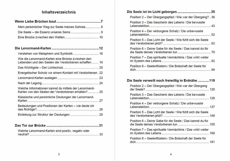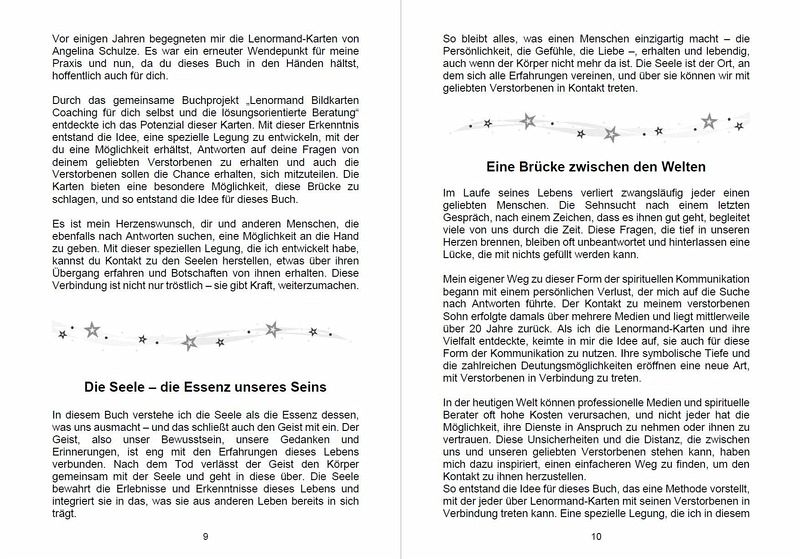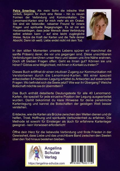 Lenormand-Karten als Brücke ins Jenseits - Verstorbene erreichen und die Botschaften ihrer Seele empfangen In den stillen Momenten des Lebens spüren wir oft die leise Nähe jener, die vor uns gegangen sind. Es ist ein zarter Hauch, ein Gefühl, ein inneres Wissen: Sie sind noch da. Und doch bleiben oft Fragen zurück: ¿ Geht es ihnen gut? ¿ Können sie uns hören? ¿ Gibt es einen Weg, mit ihnen in Kontakt zu treten? Dieses Buch bietet dir einen einfühlsamen Zugang zur geistigen Welt - durch die Symbolsprache der Lenormand-Karten, die hier als Brücke zwischen Himmel und Erde dienen. Es liegt mir am Herzen, dass jeder Mensch selbst Zugang zu dieser Art der Verbindung finden kann - ohne komplizierte Rituale oder Vorwissen. Die Lenormand-Karten werden dabei nicht als klassisches Orakel verstanden, sondern als einfühlsame Begleiter, als ratsame Freunde zwischen den Welten, die Impulse geben, Trost schenken und Türen öffnen - zu einem inneren Dialog mit der Seele eines Verstorbenen. In diesem Buch findest du: ¿ Eine speziell entwickelte 8-Positionen-Legung, mit der du Schritt für Schritt Kontakt mit dem Jenseits aufnehmen kannst. ¿ Detaillierte Deutungstexte für alle 40 Lenormand-Karten, jeweils angepasst an jede einzelne Position. ¿ Drei Varianten der Legung - je nach Seelenzustand: (Die Seele ist im Licht geborgen - Die Seele verweilt freiwillig in Erdnähe - Die Seele ist noch nicht frei für den Übergang). ¿ Erklärungen zu energetischem Schutz und innerer Ausrichtung vor der Legung ¿ Ein liebevoll gestaltetes System, das sowohl Einsteiger als auch erfahrene Kartenleger abholt Was dieses Buch besonders macht: ¿ Es ist aus gelebter Erfahrung entstanden - durch meinen eigenen Weg nach dem Tod meines Sohnes. ¿ Es verbindet spirituelle Tiefe mit Alltagstauglichkeit: kein Vorwissen nötig, nur Herz und Absicht. ¿ Die Karten werden nicht dogmatisch, sondern intuitiv und zugänglich erklärt. Jede Position ist ausführlich gedeutet - du musst nicht interpretieren, sondern darfst dich leiten lassen. ¿ Es schenkt Trost, Verbindung, Zuversicht - und vor allem: die Erfahrung, dass Liebe über den Tod hinaus wirkt Petra Smerling: "Als mein Sohn die irdische Welt verließ, begann für mich eine Reise - hin zu neuen Formen der Verbindung und Kommunikation. Dieses Buch ist meine Einladung an dich, deinen eigenen Weg mit den Lenormand Karten zu finden - liebevoll, sicher und getragen von deiner inneren Absicht. Denn ich weiß: Liebe endet nicht mit dem Tod."