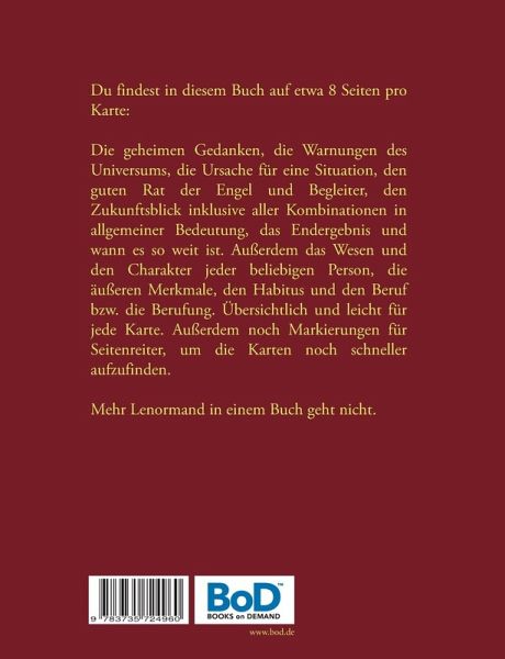 Ging es dir auch schon einmal so, dass du versucht hast, mit Hilfe der Lenormandkarten die Antwort auf eine wichtige Frage zu finden, wie zum Beispiel auf: Wird ER oder SIE sich noch einmal bei mir melden? - und dann mit der Kombination Baum und Vögel (bzw. Eulen) so Antworten wie: "In einem Wald." bekommen hast und ebenso schlau warst wie zuvor? Ja genau so ging es mir auch damals, als ich begann, mit den "Lennis" zu arbeiten.Damit dir so etwas nicht mehr vorkommt, hab ich in meinem auf langjährige Erfahrungen gründenden Verständnis der "Lennis", alle Antworten, die ich für sinnvoll halte, aufgeschrieben.Hier findest du neben allen möglichen Kartenkombination auch alle sinnvollen Zeitangaben, Persönlichkeitsmerkmale und vor allem: Wie eine Situation am Ende ausgehen wird. Und das auch noch so, dass du dich einfach darin zurecht findest und schnell zu deinen Antworten gelangst.Ich hab mir die Mühe gemacht, aus dem riesigen Lenormand- Universum das Wissen zu extrahieren, das dir und deinen Fragen wirklich weiter helfen kann. So bin ich mir sicher, dass es für dich die Arbeit mit dem Lenormand auf eine neue Stufe heben wird.Du findest hier auf etwa 8 Seiten je Karte: Die geheimen Gedanken, die Warnungen des Universums, die Ursache für eine Situation, den guten Rat der Engel und Begleiter, den Zukunftsblick inklusive aller Kombinationen in allgemeiner Bedeutung, das Endergebnis und wann es so weit ist. Außerdem das Wesen und den Charakter jeder beliebigen Person, die äußeren Merkmale, den Habitus und den Beruf bzw. die Berufung. Übersichtlich und leicht für jede Karte zu finden. Mehr Lenormand in einem Buch geht nicht.Außerdem noch Markierungen für Seitenreiter, um die Karten noch schneller aufzufinden. Ist das toll? Ich finde ja. Ich wünsche dir von Herzen viele wundervolle Erkenntnisse aus deiner neuen Lenormand Matrix.