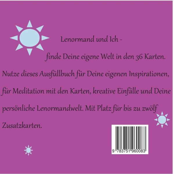 Lenormand und Ich - finde Deine eigene Welt in den 36 Karten. Nutze dieses Ausfüllbuch für Deine eigenen Inspirationen, für Meditation mit den Karten, kreative Einfälle und Deine persönliche Lenormandwelt. Mit Platz für bis zu zwölf Zusatzkarten.