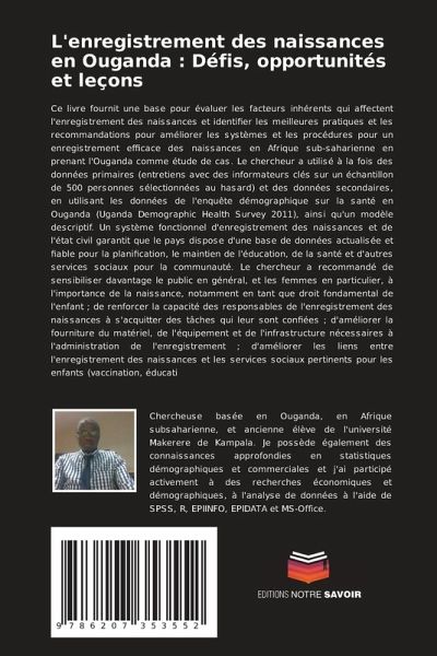 Ce livre fournit une base pour évaluer les facteurs inhérents qui affectent l'enregistrement des naissances et identifier les meilleures pratiques et les recommandations pour améliorer les systèmes et les procédures pour un enregistrement efficace des naissances en Afrique sub-saharienne en prenant l'Ouganda comme étude de cas. Le chercheur a utilisé à la fois des données primaires (entretiens avec des informateurs clés sur un échantillon de 500 personnes sélectionnées au hasard) et des données secondaires, en utilisant les données de l'enquête démographique sur la santé en Ouganda (Uganda Demographic Health Survey 2011), ainsi qu'un modèle descriptif. Un système fonctionnel d'enregistrement des naissances et de l'état civil garantit que le pays dispose d'une base de données actualisée et fiable pour la planification, le maintien de l'éducation, de la santé et d'autres services sociaux pour la communauté. Le chercheur a recommandé de sensibiliser davantage le public en général, et les femmes en particulier, à l'importance de la naissance, notamment en tant que droit fondamental de l'enfant ; de renforcer la capacité des responsables de l'enregistrement des naissances à s'acquitter des tâches qui leur sont confiées ; d'améliorer la fourniture du matériel, de l'équipement et de l'infrastructure nécessaires à l'administration de l'enregistrement ; d'améliorer les liens entre l'enregistrement des naissances et les services sociaux pertinents pour les enfants (vaccination, éducati