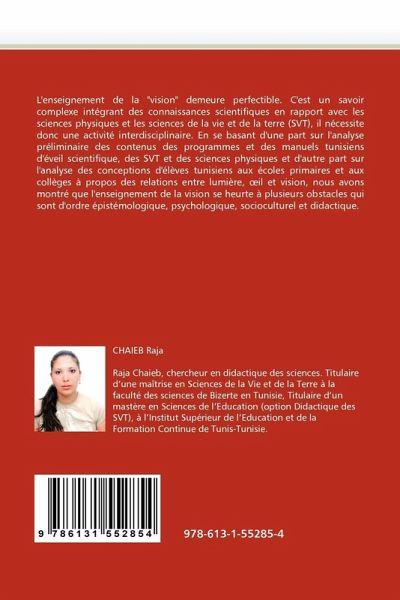 L'enseignement de la "vision" demeure perfectible. C'est un savoir complexe intégrant des connaissances scientifiques en rapport avec les sciences physiques et les sciences de la vie et de la terre (SVT), il nécessite donc une activité interdisciplinaire. En se basant d'une part sur l'analyse préliminaire des contenus des programmes et des manuels tunisiens d'éveil scientifique, des SVT et des sciences physiques et d'autre part sur l'analyse des conceptions d'élèves tunisiens aux écoles primaires et aux collèges à propos des relations entre lumière, il et vision, nous avons montré que l'enseignement de la vision se heurte à plusieurs obstacles qui sont d'ordre épistémologique, psychologique, socioculturel et didactique.