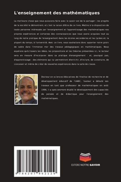 La meilleure chose que nous puissions faire avec le savoir est de le partager ; les progrès de la société le démontrent, et c'est la raison d'être de ce livre. Mettre à la disposition de toute personne intéressée par l'enseignement et l'apprentissage des mathématiques nos propres expériences et certaines des connaissances que nous avons acquises tout au long de notre pratique de l'enseignement dans les écoles secondaires et les lycées et, la plupart du temps, à l'université. Avec ce livre, nous souhaitons donc apporter notre grain de sable dans l'immense mer des travaux pédagogiques en mathématiques. Nous espérons qu'à travers les idées, les propositions et les théories présentées ici, le lecteur sera en mesure d'incorporer dans sa pratique d'enseignement - et, pourquoi pas, d'apprentissage - des éléments qui lui permettront d'enrichir, d'inclure, de construire, de concevoir et même de créer de nouvelles expériences dans la salle de classe.