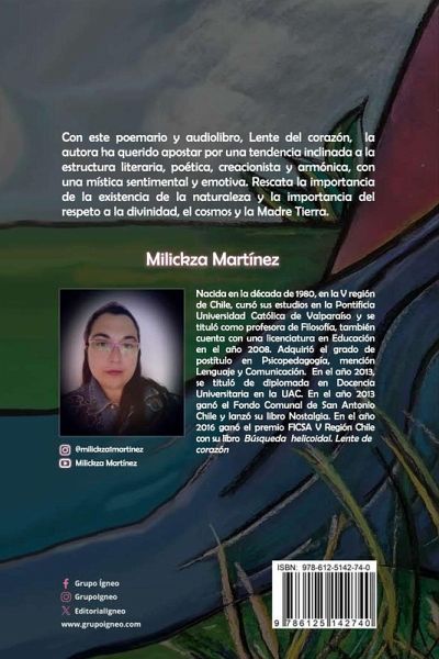 Con este poemario y audiolibro, Lente del corazón, la autora ha querido apostar por una tendencia inclinada a la estructura literaria, poética, creacionista y armónica, con una mística sentimental y emotiva. Rescata la importancia de la existencia de la naturaleza y la importancia del respeto a la divinidad, el cosmos y la Madre Tierra. Milickza Martínez Nacida en la década de 1980, en la V región de Chile, cursó sus estudios en la Pontificia Universidad Católica de Valparaíso y se tituló como profesora de Filosofía, también cuenta con una licenciatura en Educación en el año 2008. Adquirió el grado de postítulo en Psicopedagogía, mención Lenguaje y Comunicación. En el año 2013, se tituló de diplomada en Docencia Universitaria en la UAC. En el año 2013 ganó el Fondo Comunal de San Antonio Chile y lanzó su libro Nostalgia. En el año 2016 ganó el premio FICSA V Región Chile con su libro Búsqueda helicoidal. Lente del corazón.