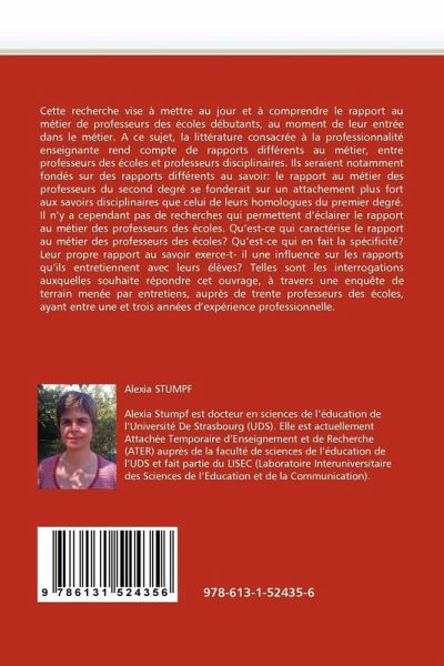 Cette recherche vise à mettre au jour et à comprendre le rapport au métier de professeurs des écoles débutants, au moment de leur entrée dans le métier. A ce sujet, la littérature consacrée à la professionnalité enseignante rend compte de rapports différents au métier, entre professeurs des écoles et professeurs disciplinaires. Ils seraient notamment fondés sur des rapports différents au savoir: le rapport au métier des professeurs du second degré se fonderait sur un attachement plus fort aux savoirs disciplinaires que celui de leurs homologues du premier degré. Il n y a cependant pas de recherches qui permettent d éclairer le rapport au métier des professeurs des écoles. Qu est-ce qui caractérise le rapport au métier des professeurs des écoles? Qu est-ce qui en fait la spécificité? Leur propre rapport au savoir exerce-t- il une influence sur les rapports qu ils entretiennent avec leurs élèves? Telles sont les interrogations auxquelles souhaite répondre cet ouvrage, à travers une enquête de terrain menée par entretiens, auprès de trente professeurs des écoles, ayant entre une et trois années d expérience professionnelle.
