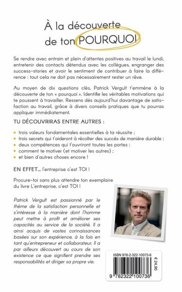 Se rendre avec entrain et plein d'attentes positives au travail le lundi, entretenir des contacts détendus avec les collègues, engranger des success-stories et avoir le sentiment de contribuer à faire la différence : tout cela ne doit pas nécessairement rester un rêve.Au moyen de dix questions clés, Patrick Vergult t'emmène à la découverte de ton « pourquoi ». Identifie les véritables motivations qui te poussent à travailler. Ressens dès aujourd'hui davantage de satisfaction au travail, grâce à divers conseils pratiques que tu pourras appliquer immédiatement.Tu découvriras entre autres :- trois valeurs fondamentales essentielles à ta réussite ;- trois secrets qui t'aideront à récolter des succès de manière durable ;- deux compétences qui t'ouvriront toutes les portes ;- comment te motiver (et motiver les autres) ;- et bien d'autres choses encore !En effet... l'entreprise c'est TOI !Procure-toi sans plus attendre ton exemplaire du livre L'entreprise, c'est TOI !