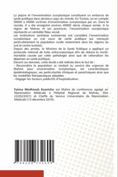 La piqûre et l'envenimation scorpionique constituent un embarras de santé publique dans plusieurs pays du monde. En Tunisie, on en compte 30000 à 45000 victimes d'envenimation scorpionique par an. Dans le monde, il a été enregistré environ 40000 décès chaque année. A la région de Mahres et ses provinces, l'envenimation scorpionique représente un véritable fléau social.Les institutions sanitaires tunisiennes ont considéré l'envenimation scorpionique un vrai souci de santé publique qui menaçait particulièrement la population rurale notamment dans les régions du sud et centre tunisien.Depuis des années, le Ministre de la Santé Publique a appliqué un protocole national de lutte antiscorpionique afin de réduire la morbi-mortalité causée par cette pathologie ainsi que de rationaliser les dépenses en santé publique.Devant ces données, cette étude a été réalisée dans le but de :- Reconnaître la population se rendant au service des urgences de Mahres pour envenimation scorpionique, ses caractéristiques épidémiologiques, ses particularités cliniques et paracliniques ainsi que les modalités thérapeutiques adoptées.- Dégager les facteurs prédictifs d'hospitalisation.