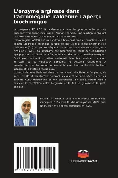 La L-arginase (EC 3.5.3.1), la dernière enzyme du cycle de l'urée, est une métalloenzyme binucléaire Mn2+. L'enzyme catalyse une réaction impliquant l'hydrolyse de la L-arginine en L-ornithine et en urée.L'acromégalie (ACRO) est un syndrome hormonal rare et complexe classé comme un trouble chronique caractérisé par un taux élevé d'hormone de croissance (GH) et, par conséquent, de facteur de croissance analogue à l'insuline-1 (IGF-1). Ce syndrome est généralement causé par un adénome hypophysaire sécrétant de la GH, entraînant des impacts multisystémiques. Ces impacts touchent le système ostéo-articulaire, les muscles, le cerveau, le coeur et les vaisseaux sanguins, le système respiratoire et hématopoïétique, les reins, le foie et le pancréas, la thyroïde, le tissu adipeux et le système métabolique.L'objectif de cette étude est d'évaluer les niveaux d'activité de l'arginase, de la GH, de l'IGF-1, du glucose, du profil lipidique et de l'urée sérique chez les patients ACRO diabétiques et non diabétiques. En outre, l'étude vise à explorer la corrélation entre l'arginase et la GH, le glucose et le profil lipidique.