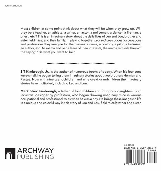 Most children at some point think about what they will be when they grow up. Will they be a teacher, an athlete, a writer, an actor, a policeman, a dancer, a fireman, a priest, etc.? This is an imaginary story about the daily lives of Leo and Lou, brother and sister field mice, and their family. In playing together Leo and Lou suggest occupations and professions they imagine for themselves: a nurse, a cowboy, a pilot, a ballerina, an author, etc. As mama and papa learn of their interests, the mama reminds them of the saying: "Be what you want to be."