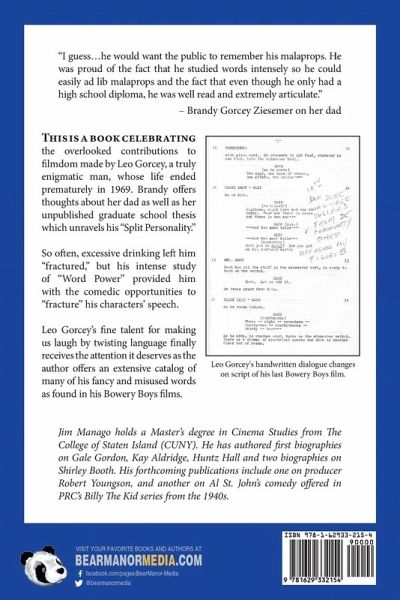 "I guess…he would want the public to remember his malaprops. He was proud of the fact that he studied words intensely so he could easily ad lib malaprops and the fact that even though he only had a high school diploma, he was well read and extremely articulate." - Brandy Gorcey Ziesemer on her dad This is a book celebrating the overlooked contributions to filmdom made by Leo Gorcey, a truly enigmatic man, whose life ended prematurely in 1969. Brandy offers thoughts about her dad as well as her unpublished graduate school thesis which unravels his "Split Personality." So often, excessive drinking left him "fractured," but his intense study of "Word Power" provided him with the comedic opportunities to "fracture" his characters' speech. Leo Gorcey's fine talent for making us laugh by twisting language finally receives the attention it deserves as the author offers an extensive catalog of many of his fancy and misused words as found in his Bowery Boys films. Jim Manago holds a Master's degree in Cinema Studies from The College of Staten Island (CUNY). He has authored first biographies on Gale Gordon, Kay Aldridge, Huntz Hall and two biographies on Shirley Booth. His forthcoming publications include one on producer Robert Youngson, and another on Al St. John's comedy offered in PRC's Billy The Kid series from the 1940s.