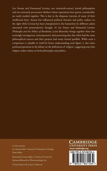 Leo Strauss and Emmanuel Levinas, two twentieth-century Jewish philosophers and two extremely provocative thinkers whose reputations have grown considerably over the last twenty years, are rarely studied together. This is due to the disparate interests of many of their intellectual heirs. Strauss has influenced political theorists and policy makers on the right while Levinas has been championed in the humanities by different cadres associated with postmodernist thought. In Leo Strauss and Emmanuel Levinas: Philosophy and the Politics of Revelation, Leora Batnitzky brings together these two seemingly incongruous contemporaries, demonstrating that they often had the same philosophical sources and their projects had many formal parallels. While such a comparison is valuable in itself for better understanding each figure, it also raises profound questions in the current debate on the definitions of 'religion', suggesting new ways that religion makes claims on both philosophy and politics.