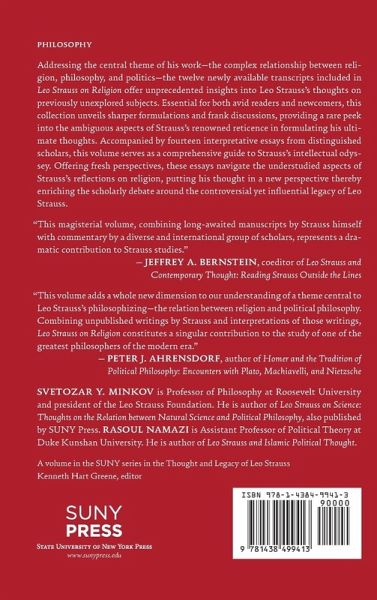 Addressing the central theme of his work-the complex relationship between religion, philosophy, and politics-the twelve newly available transcripts included in Leo Strauss on Religion offer unprecedented insights into Leo Strauss's thoughts on previously unexplored subjects. Essential for both avid readers and newcomers, this collection unveils sharper formulations and frank discussions, providing a rare peek into the ambiguous aspects of Strauss's renowned reticence in formulating his ultimate thoughts. Accompanied by fourteen interpretative essays from distinguished scholars, this volume serves as a comprehensive guide to Strauss's intellectual odyssey. Offering fresh perspectives, these essays navigate the understudied aspects of Strauss's reflections on religion, putting his thought in a new perspective thereby enriching the scholarly debate around the controversial yet influential legacy of Leo Strauss.
