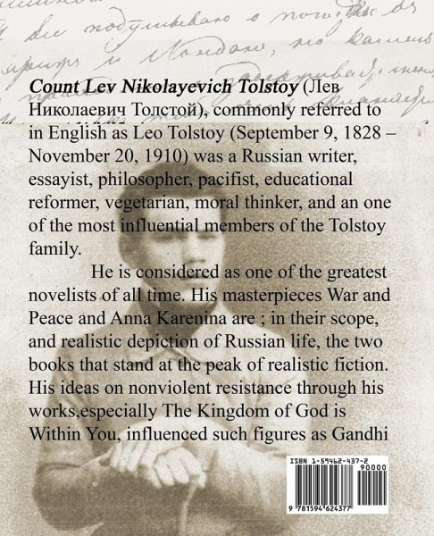 Count Lev Nikolayevich Tolstoy, commonly referred to in English as Leo Tolstoy (September 9, 1828 - November 20, 1910) was a Russian writer, essayist, philosopher, pacifist, educational reformer, vegetarian, moral thinker, and an one of the most influential members of the Tolstoy family.