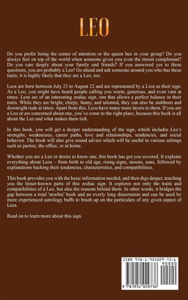 If you want to learn about the Leo zodiac sign, then keep reading... Do you always look for attention when you are in a public setting? Are you addicted to shopping? Maybe you are attracted to high-priced luxury items? If you answered yes to these questions, you may be a Leo. If you know someone who possesses these traits, it could mean that they are a Leo too. With this book, you will learn all the positive and negative aspects of a Leo, as well as how to navigate these characteristics to better succeed in life. With this book, you will learn:Everything about Leos including their house, element, sign, ruling planet, lucky number, and colors. Other zodiac signs and how they compare to a Leo. About famous Leos and their significant traits. All there is to know about cusp Leos and their behaviors. How Leos behave at work and in private relationships. How to master all the strengths and weaknesses of a Leo. How to recognize the traits and gifts of a Leo child. How to bring out the best in your Leo child. Understanding how a Leo behaves when they're in love. How to keep a healthy, long-term friendship with a Leo. Some successful career paths for Leos. What a Leo truly needs. With this guide, you will become a better Leo and learn how to thrive in the world. If you are reading this to attract a Leo, or perhaps you already know one and want to unravel their secrets, then this is the perfect guide for you. Grab your copy of this book now to begin your path to understanding the true face of all Leos.