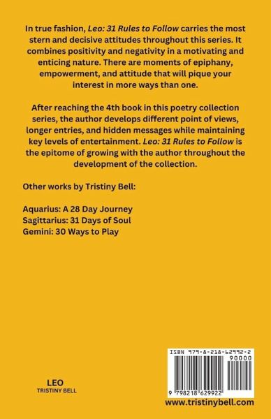 In true fashion, Leo: 31 Rules to Follow carries the most stern and decisive attitudes throughout this series. It combines positivity and negativity in a motivating and enticing nature. There are moments of epiphany, empowerment and attitude that will peak your interest in more ways than one. After reaching the 4th book in this poetry collection series, the author develops different points of view, longer entries and hidden messages all while maintaining entertainment. Leo: 31 Rules to Follow is the epitome of growing with the author throughout the development of the collection.