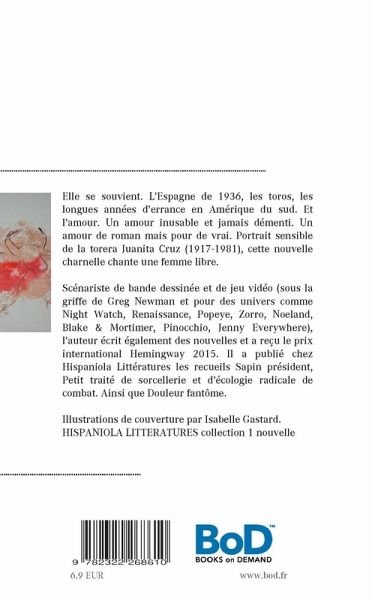 Elle se nomme Juanita Cruz. Et elle se souvient. L'Espagne de 1936, les toros, les longues années d'errance en Amérique du sud. Et l'amour. Un amour inusable et jamais démenti. Un amour comme dans les romans mais pour de vrai. Portrait sensible de Juanita Cruz (1917-1981), torera, cette nouvelle charnelle chante une femme libre.Scénariste de bande dessinée et de jeu vidéo (sous la griffe de Greg Newman et pour des univers comme Night Watch, Renaissance, Popeye, Zorro, Noeland, Blake & Mortimer, Pinocchio, Jenny Everywhere), l'auteur écrit également des nouvelles et a reçu le prix international Hemingway 2015. Il a publié chez Hispaniola Littératures les recueils Sapin président, Petit traité de sorcellerie et d'écologie radicale de combat. Ainsi que Douleur fantôme.Illustrations de couverture par Isabelle Gastard.HISPANIOLA LITTERATURES collection 1 nouvelle