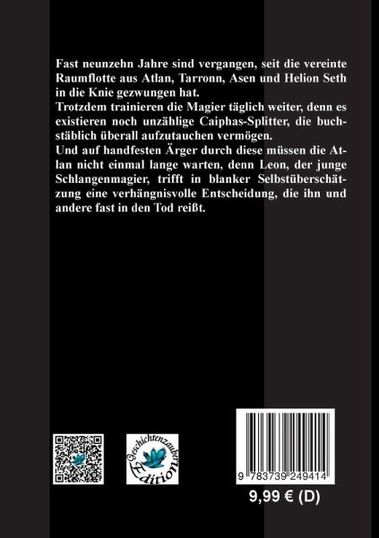 Fast neunzehn Jahre sind vergangen, seit die vereinte Raumflotte aus Atlan, Tarronn, Asen und Helion Seth in die Knie gezwungen hat. Trotzdem trainieren die Magier täglich weiter, denn es existieren noch unzählige Caiphas-Splitter, die buchstäblich überall aufzutauchen vermögen.Und auf handfesten Ärger durch diese müssen die Atlan nicht einmal lange warten, denn Leon, der junge Schlangenmagier, trifft in blanker Selbstüberschätzung eine verhängnisvolle Entscheidung, die ihn und andere fast in den Tod reißt.