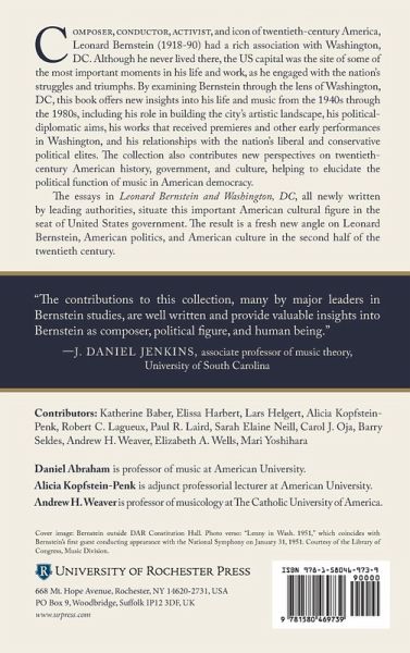 Composer, conductor, activist, and icon of twentieth-century America, Leonard Bernstein (1918-90) had a rich association with Washington, DC. Although he never lived there, the US capital was the site of some of the most important moments in his life and work, as he engaged with the nation's struggles and triumphs. By examining Bernstein through the lens of DC, this book offers new insights into his life and music from the 1940s through the 1980s, including his role in building DC's artistic landscape, his political-diplomatic aims, his works that received premieres and other early performances in DC, and his relationships with the nation's liberal and conservative political elites. The collection also contributes new perspectives on twentieth-century American history, government, and culture, helping to elucidate the political function of music in American democracy. The essays in Leonard Bernstein and Washington, DC, all newly written by leading authorities, situate this important American cultural figure in the seat of United States government. The result is a fresh new angle on Leonard Bernstein, American politics, and American culture in the second half of the twentieth century. Daniel Abraham is Professor of Music at American University, Alicia Kopfstein-Penk is Adjunct Professorial Lecturer at American University, and Andrew H. Weaver is Professor of Musicology at The Catholic University of America.