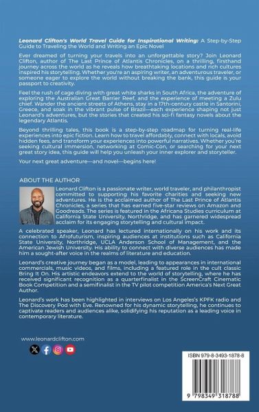 Leonard Clifton's World Travel Guide for Inspirational Writing: A Step-by-Step Guide to Traveling the World and Writing an Epic Novel Ever dreamed of turning your travels into an unforgettable story? Join Leonard Clifton, author of The Last Prince of Atlantis Chronicles, on a thrilling, firsthand journey across the world as he reveals how breathtaking locations and rich cultures inspired his storytelling. Whether you're an aspiring writer, an adventurous traveler, or someone eager to explore the world without breaking the bank, this guide is your passport to creativity. Feel the rush of cage diving with great white sharks in South Africa, the adventure of exploring the Australian Great Barrier Reef, and the experience of meeting a Zulu chief. Wander the ancient streets of Athens, stay in a 17th-century castle in Santorini, Greece, and soak in the vibrant pulse of Brazil-each experience shaping not just Leonard's adventures, but the stories that created his sci-fi fantasy novels about the legendary Atlantis. Beyond thrilling tales, this book is a step-by-step roadmap for turning real-life experiences into epic fiction. Learn how to travel affordably, connect with locals, avoid hidden fees, and transform your experiences into powerful narratives. Whether you're seeking cultural immersion, networking at Comic-Con, or searching for your next great story idea, this guide will help you unleash your inner explorer and storyteller. Your next great adventure-and novel-begins here!