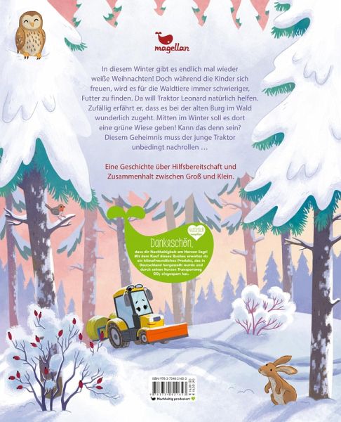 Das fünfte Vorleseabenteuer über den beliebten Traktor mit spannenden Sachinfos über die Landwirtschaft! Endlich mal wieder weiße Weihnachten! Doch während die Kinder sich freuen, wird es für die Tiere im Wald immer schwieriger, Futter zu finden. Schließlich kommen sie ins Dorf und stürmen die Weihnachtsbaum-Verkaufsstände. Oje, Weihnachten ist in Gefahr! Da will Traktor Leonard natürlich helfen. Zufällig erfährt er, dass es bei der alten Burg im Wald wunderlich zugeht. Mitten im Winter soll es dort eine grüne Wiese geben! Kann das denn sein? Der Sache muss der junge Traktor unbedingt nachrollen ... Eine Geschichte über Hilfsbereitschaft und Zusammenhalt zwischen Groß und Klein.