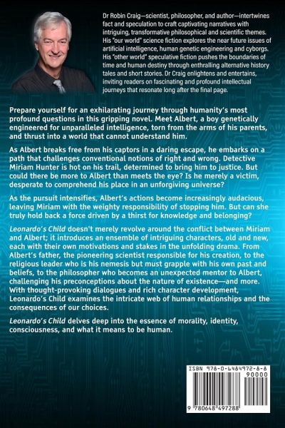 Prepare yourself for an exhilarating journey through humanity's most profound questions in this gripping novel. Meet Albert, a boy genetically engineered for unparalleled intelligence, torn from the arms of his parents, and thrust into a world that cannot understand him. As Albert breaks free from his captors in a daring escape, he embarks on a path that challenges conventional notions of right and wrong. Detective Miriam Hunter is hot on his trail, determined to bring him to justice. But could there be more to Albert than meets the eye? Is he merely a victim, desperate to comprehend his place in an unforgiving universe? As the pursuit intensifies, Albert's actions become increasingly audacious, leaving Miriam with the weighty responsibility of stopping him. But can she truly hold back a force driven by a thirst for knowledge and belonging? Leonardo's Child doesn't merely revolve around the conflict between Miriam and Albert; it introduces an ensemble of intriguing characters, old and new, each with their own motivations and stakes in the unfolding drama. From Albert's father, the pioneering scientist responsible for his creation, to the religious leader who is his nemesis but must grapple with his own past and beliefs, to the philosopher who becomes an unexpected mentor to Albert, challenging his preconceptions about the nature of existence-and more. With thought-provoking dialogues and rich character development, Leonardo's Child examines the intricate web of human relationships and the consequences of our choices. Leonardo's Child delves deep into the essence of morality, identity, consciousness, and what it means to be human. Brace yourself for an explosive climax as the clash between Miriam and Albert hurtles towards its mind-bending resolution.