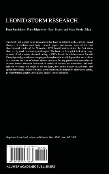 This book will appeal to all researchers that have an interest in the current Leonid showers. It contains over forty research papers that present some of the first observational results of the November 1999 Leonid meteor storm, the first storm observed by modern observing techniques. The book is a first glimpse of the large amount of information obtained during NASA's Leonid Multi-Instrument Aircraft Campaign and groundbased campaigns throughout the world. It provides an excellent overview on the state of meteor shower research for any professional researcher or amateur meteor observer interested in studies of meteors and meteoroids and their relation to comets, the origin of life on Earth, the satellite impact hazard issue, and upper atmosphere studies of neutral atom chemistry, the formation of meteoric debris, persistent trains, airglow, noctilucent clouds, sprites and elves.