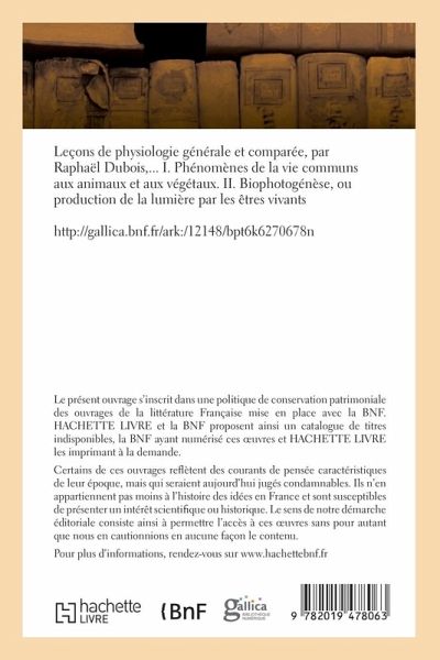 Leçons de physiologie générale et comparée, par Raphaël Dubois, ... I. Phénomènes de la vie communs aux animaux et aux végétaux. II. Biophotogénèse, ou production de la lumière par les êtres vivants Date de l'édition originale: 1898 Sujet de l'ouvrage: Physiologie comparée -- Ouvrages de référence Contient une table des matièresAvec mode texte Le présent ouvrage s'inscrit dans une politique de conservation patrimoniale des ouvrages de la littérature Française mise en place avec la BNF. HACHETTE LIVRE et la BNF proposent ainsi un catalogue de titres indisponibles, la BNF ayant numérisé ces oeuvres et HACHETTE LIVRE les imprimant à la demande. Certains de ces ouvrages reflètent des courants de pensée caractéristiques de leur époque, mais qui seraient aujourd'hui jugés condamnables. Ils n'en appartiennent pas moins à l'histoire des idées en France et sont susceptibles de présenter un intérêt scientifique ou historique. Le sens de notre démarche éditoriale consiste ainsi à permettre l'accès à ces oeuvres sans pour autant que nous en cautionnions en aucune façon le contenu. Pour plus d'informations, rendez-vous sur www.hachettebnf.fr