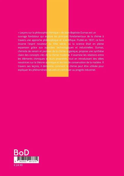 « Leçons sur la philosophie chimique » de Jean-Baptiste Dumas est un ouvrage fondateur qui explore les principes fondamentaux de la chimie à travers une approche philosophique et scientifique. Publié en 1837, ce livre incarne l'esprit novateur du XIXe siècle, où la science était en pleine expansion grâce aux avancées technologiques et industrielles. Dumas, chimiste de renom et pionnier de la chimie organique, propose une synthèse claire des concepts clés de la chimie moderne. Il examine les relations entre les éléments chimiques et leurs propriétés, tout en introduisant des idées novatrices sur la théorie atomique et les lois de conservation de la matière. À travers ses leçons, il démontre comment la chimie peut être utilisée pour expliquer les phénomènes naturels et contribuer au progrès industriel. L'ouvrage aborde également l'importance de l'enseignement scientifique, mettant en lumière les méthodes pédagogiques nécessaires pour transmettre les connaissances complexes de la chimie à un public élargi. Dumas insiste sur le rôle de la science dans le développement économique et social, faisant de ce livre une référence incontournable pour comprendre l'impact des sciences sur la société du XIXe siècle. « Leçons sur la philosophie chimique » est une oeuvre essentielle pour les amateurs d'histoire des sciences et les passionnés de chimie. Elle s'inscrit dans les catégories des ouvrages scientifiques classiques et des études philosophiques sur les sciences. Ce livre reste une source précieuse pour quiconque souhaite explorer les bases théoriques qui ont façonné la chimie moderne.