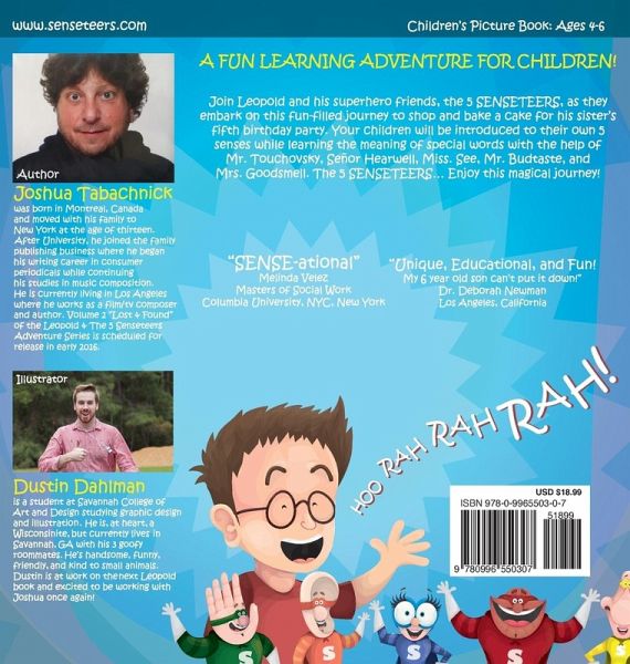 A fun learning adventure for children as 6-year old Leopold learns about his 5 senses with the help of his superhero friends, the 5 SENSETEERS. They embark on a fun-filled journey to shop and bake a cake for his sister's fifth birthday party, all the while teaching your children about their own 5 senses with the help of Mr. Touchovsky, Señor Hearwell, Miss. See, Mr. Budtaste, and Mrs. Goodsmell - the 5 SENSETEERS. Leopold also learns both the meaning of special words, and that although we are all different and offer unique and individual traits, it is much better when we come together and work as one.