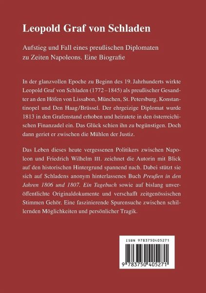 Leopold Graf von Schladen Aufstieg und Sturz eines preußischen Diplomaten zu Zeiten Napoleons. Eine Biografie. In der glanzvollen Epoche zu Beginn des 19. Jahrhunderts wirkte Leopold Graf von Schladen (1772-1845) als preußischer Gesandter an den Höfen von Lissabon, München, St. Petersburg, Konstantinopel und Den Haag/Brüssel. Der ehrgeizige Diplomat wurde 1813 in den Grafenstand erhoben und heiratete in den österreichischen Finanzadel ein. Das Glück schien ihn zu begünstigen. Doch dann geriet er zwischen die Mühlen der Justiz. Das Leben dieses heute vergessenen Politikers zwischen Napoleon und Friedrich Wilhelm III. zeichnet die Autorin mit Blick auf den historischen Hintergrund spannend nach. Dabei stützt sie sich auf Schladens anonym hinterlassenes Buch "Preußen in den Jahren 1806 und 1807. Ein Tagebuch" sowie auf bislang unveröffentlichte Originaldokumente und verschafft zeitgenössischen Stimmen Gehör. Eine faszinierende Spurensuche zwischen schillernden Möglichkeiten und persönlicher Tragik. Dies Buch ist die bislang einzige Biografie über Graf von Schladen.